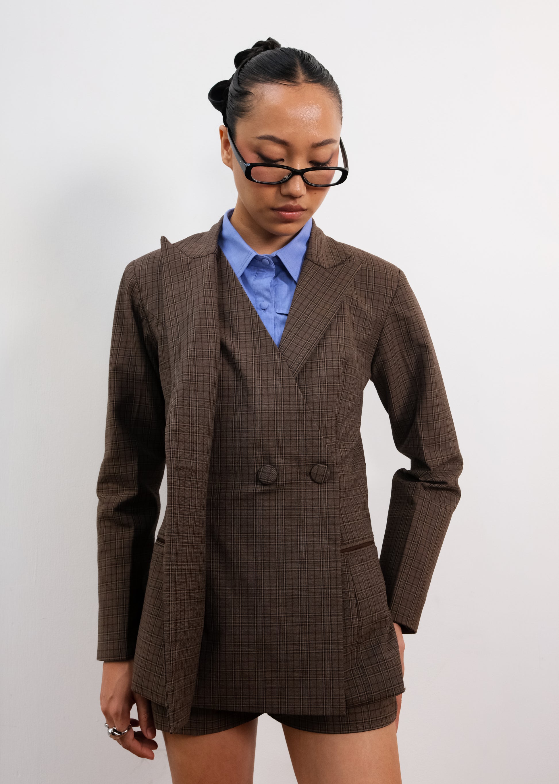 innovative double lapels. The lapels can be buttoned together to create a sleek, streamlined silhouette, while the two-button front ensures a refined, confident fit.A statement piece designed for confident, modern dressing.