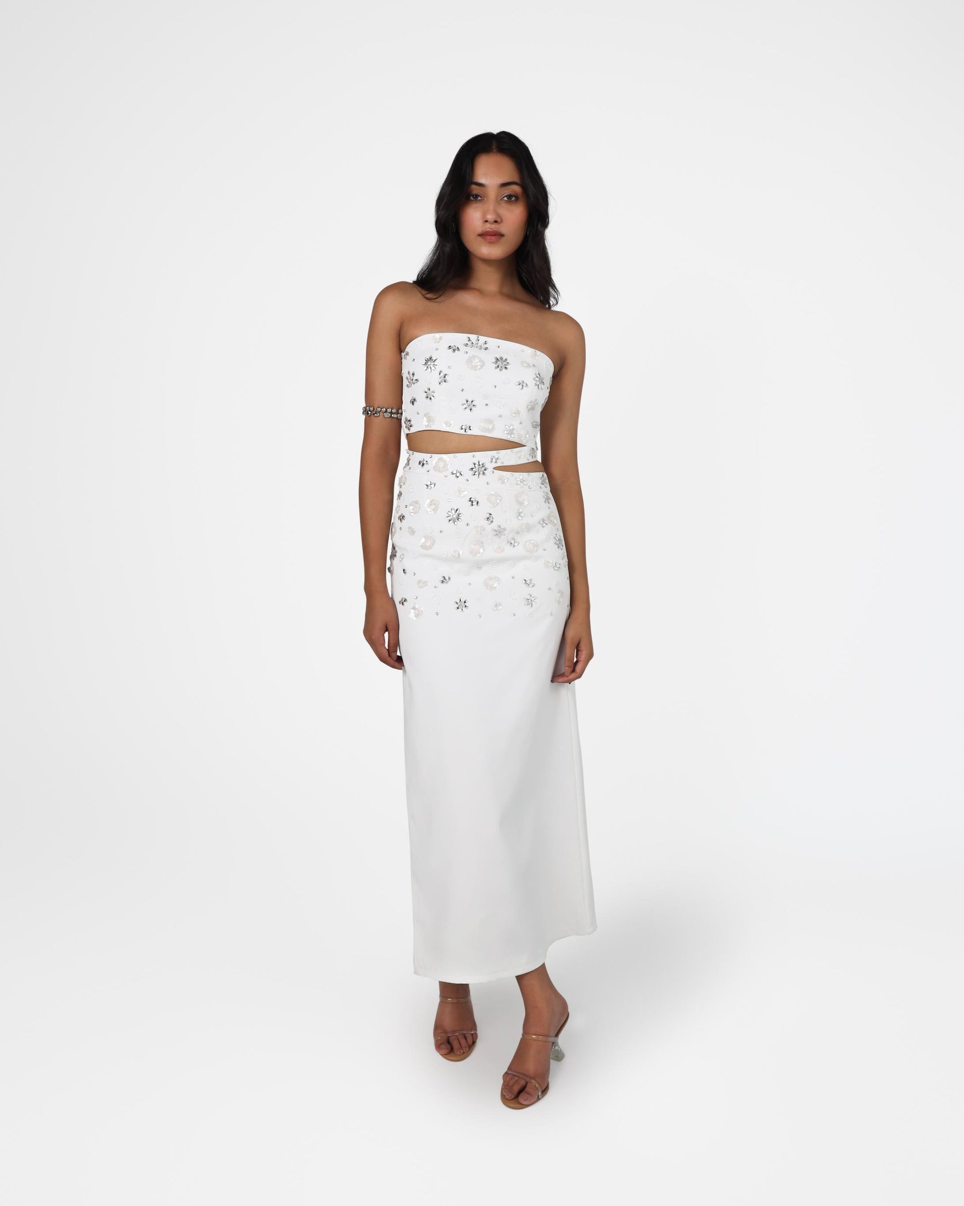 Refined and sharply tailored, this straight-cut cocktail skirt features a side slit for ease and edge. The V-cut waistline, adorned with subtle embellishments, accentuates the form — a statement in structure, sparkle, and quiet allure.