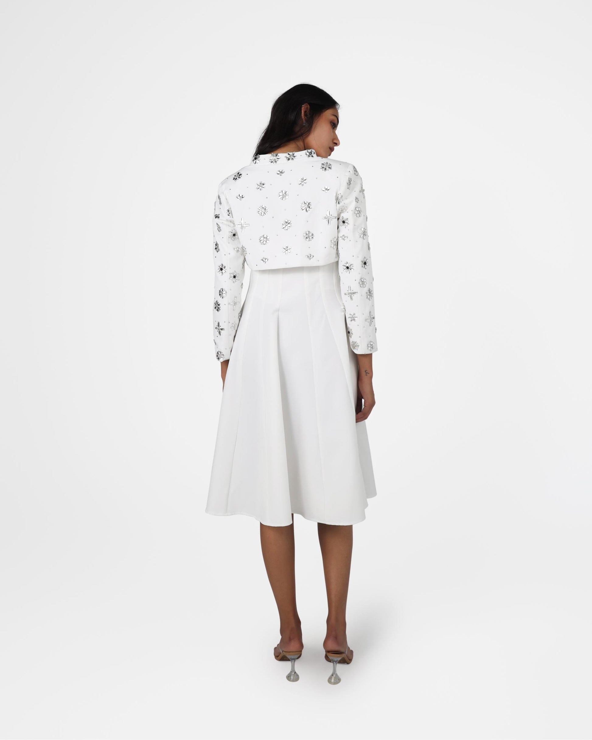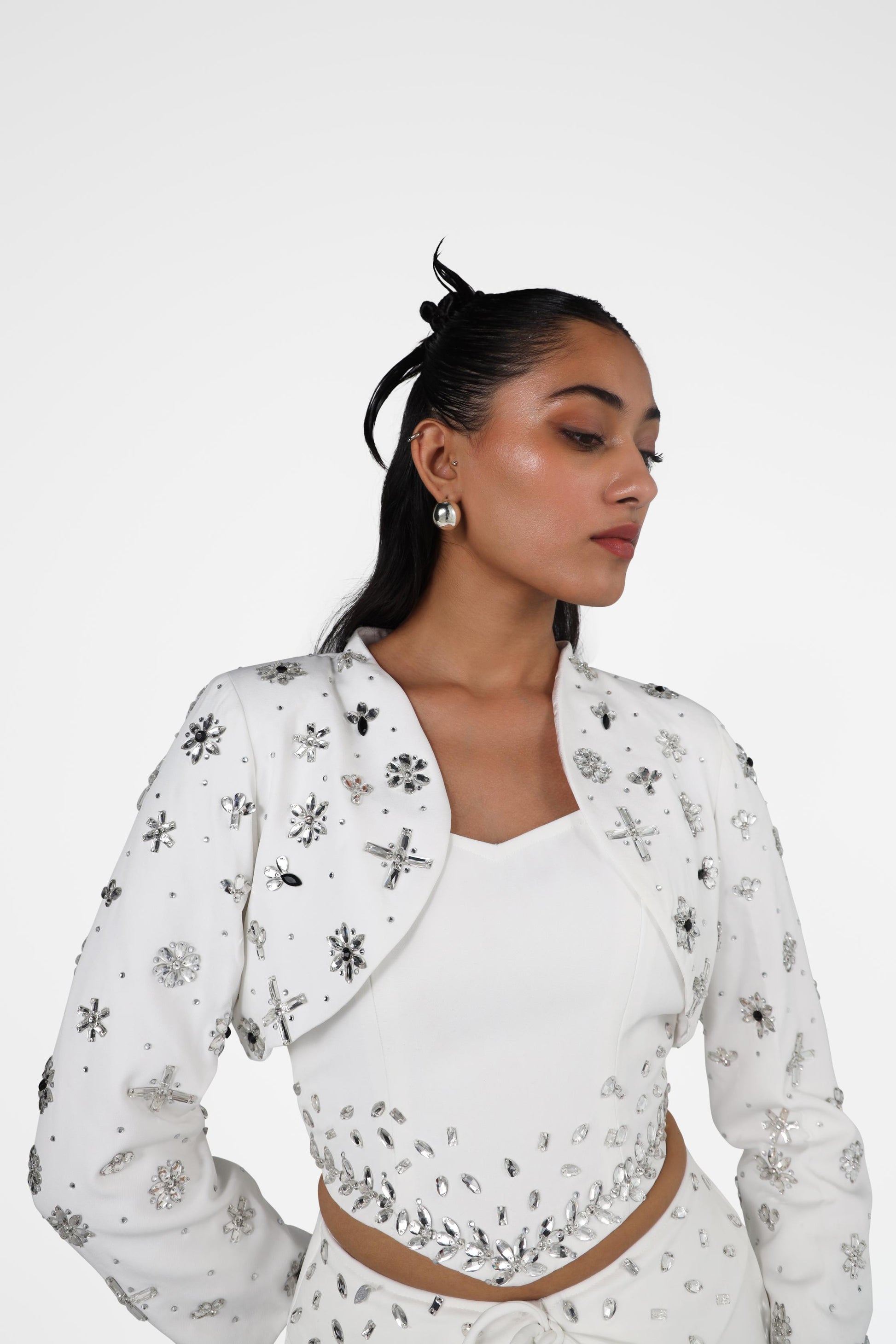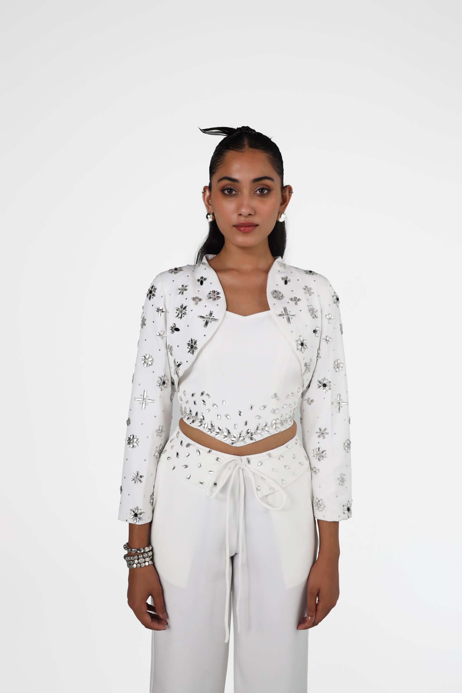 This cropped jacket is statement-making, full of embellishments, and versatile enough to elevate any outfit. Designed to flatter and elevate, it pairs seamlessly with tailored layers.