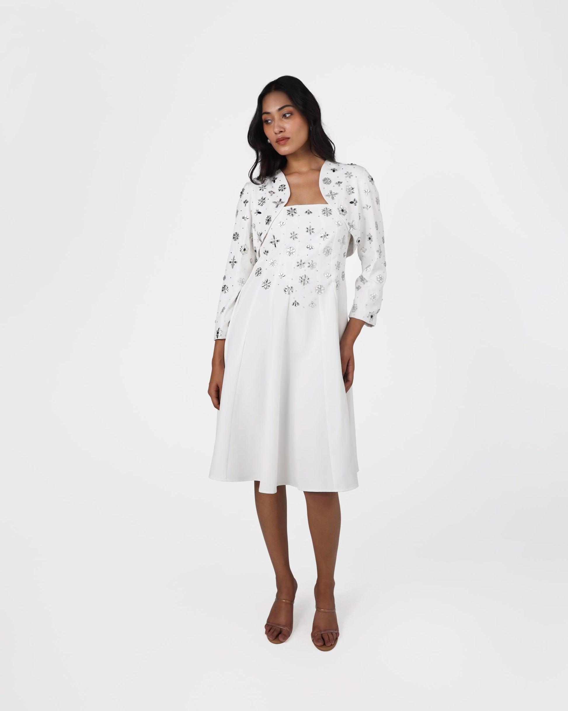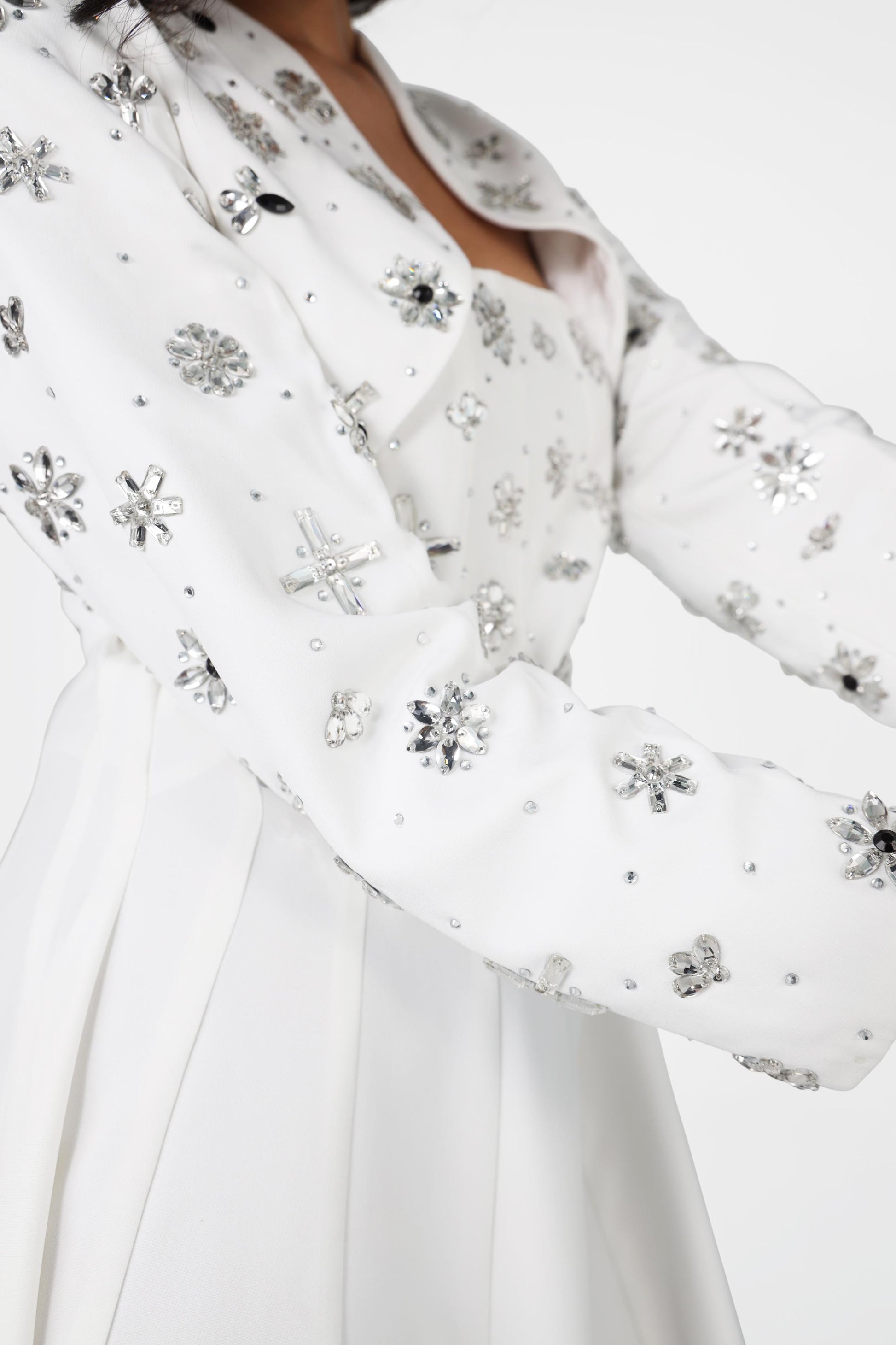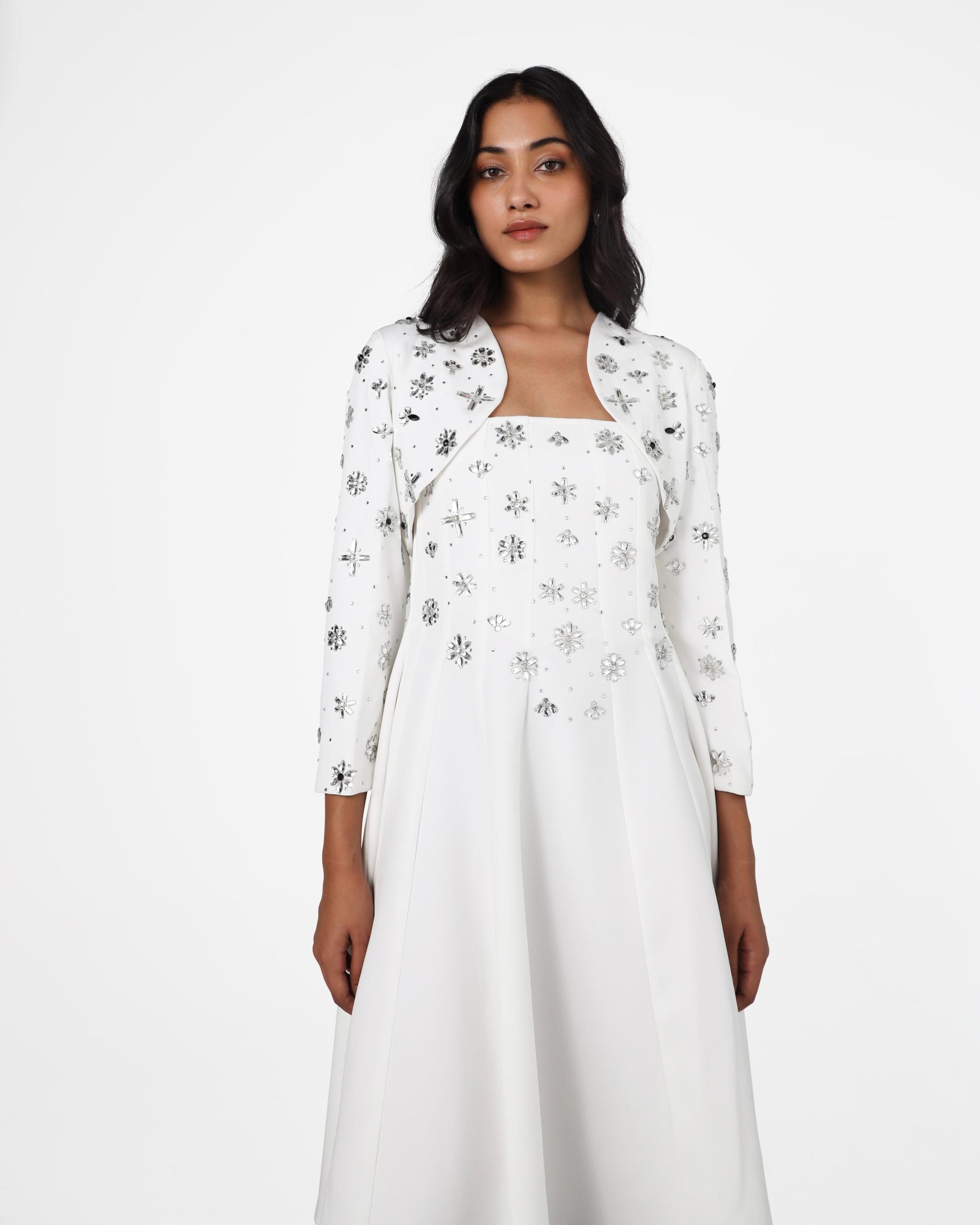 This cropped jacket is statement-making, full of embellishments, and versatile enough to elevate any outfit. Designed to flatter and elevate, it pairs seamlessly with tailored layers.