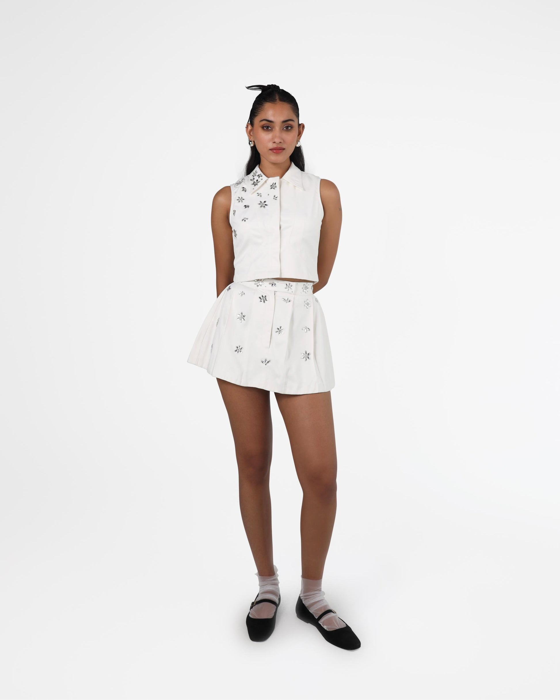 A playful take on structure, this mini skirt features sharp pleats and delicate flower-shaped embellishments that add a hint of charm and sparkle. Feminine yet bold, it’s designed to move with you — equal parts flirty and refined.