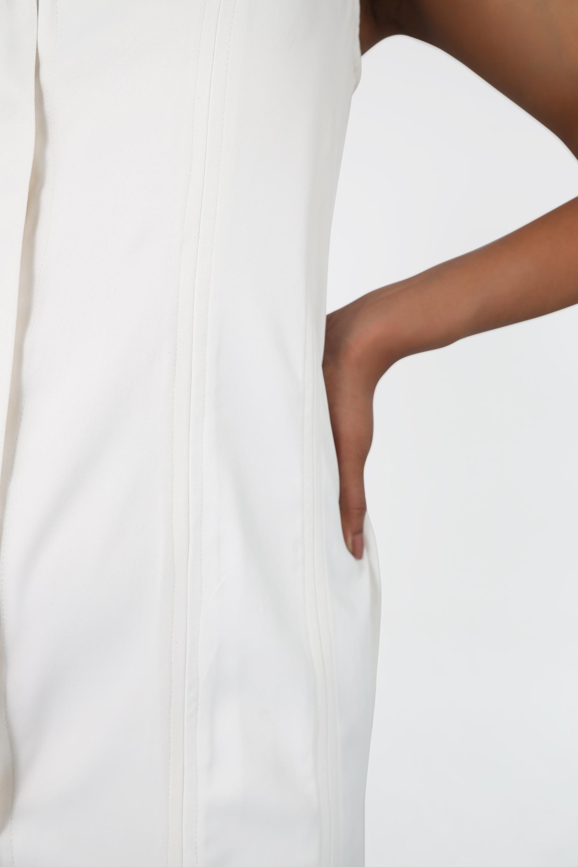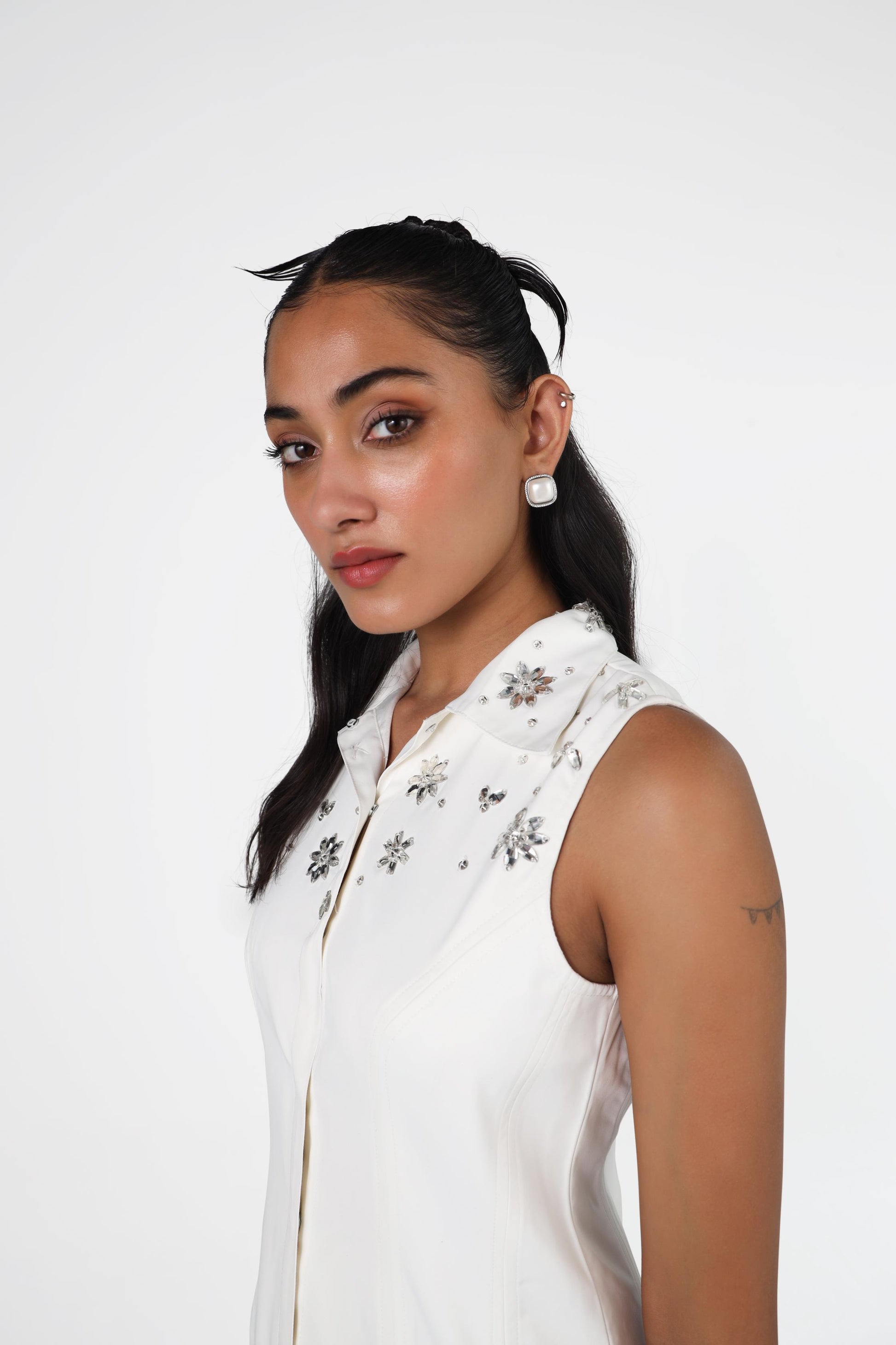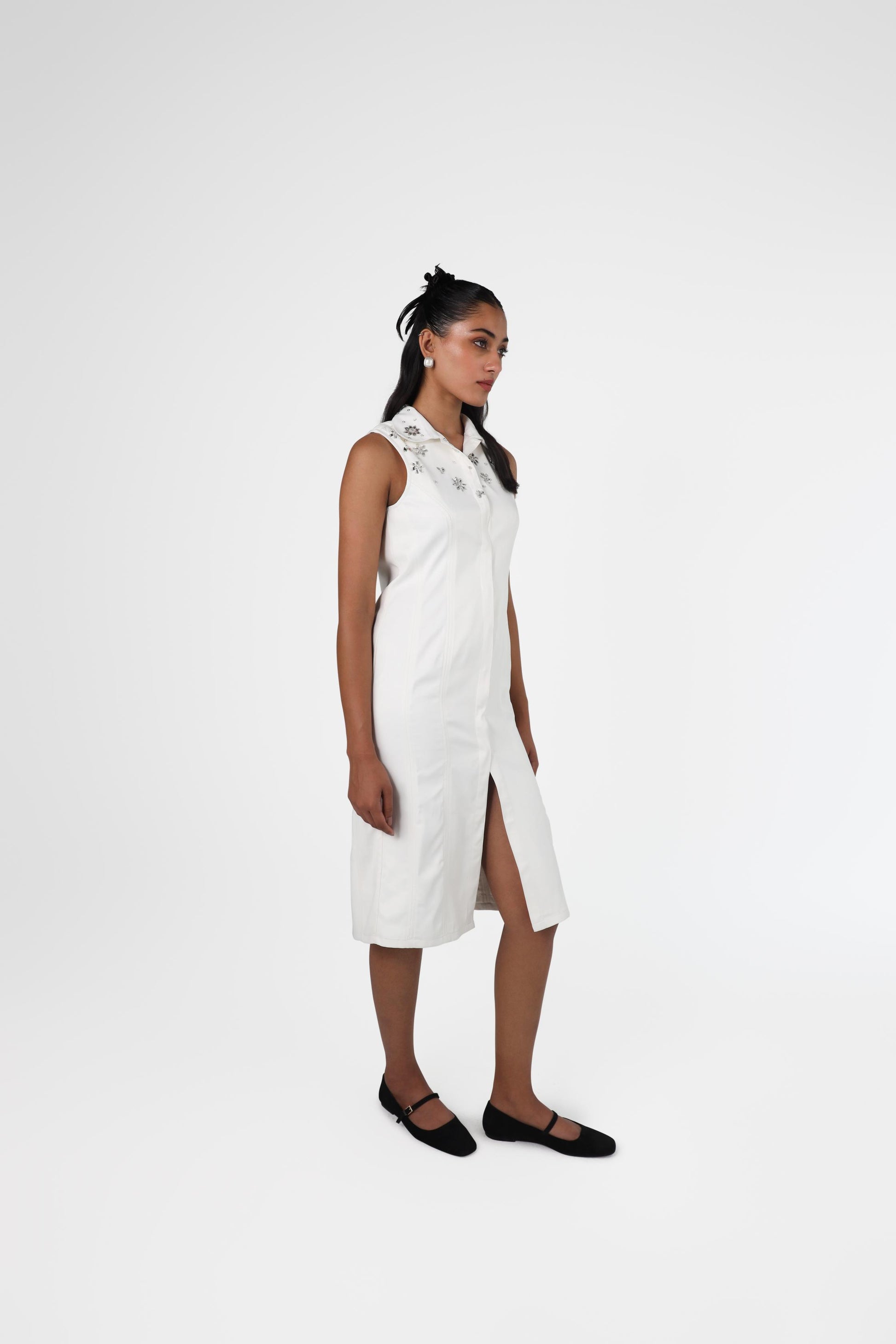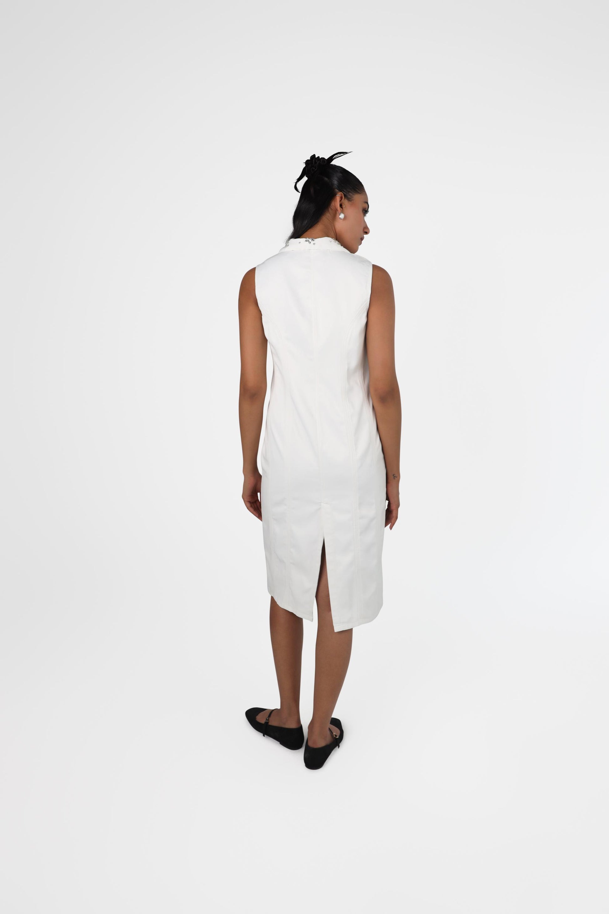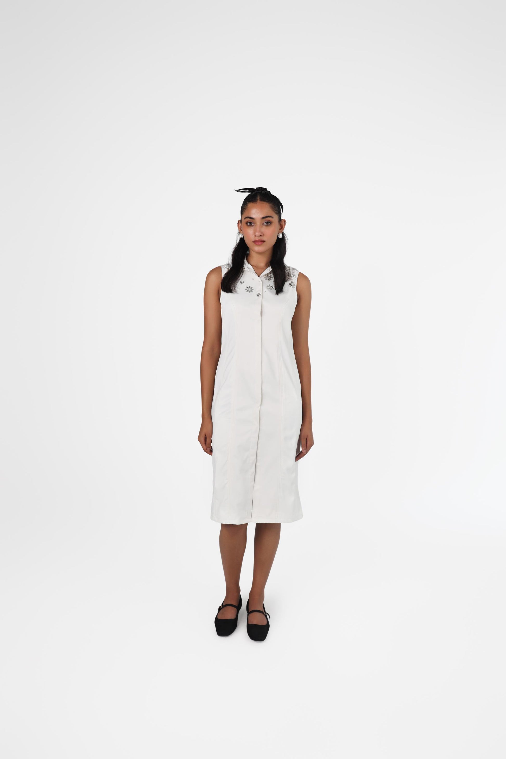 Tailored in a clean A-line silhouette, this structured dress features a delicately embellished collar and intricate linear stitching that flows from chest to hem. The detailing adds depth and quiet drama, making it a refined choice for elevated daywear or evening occasions.